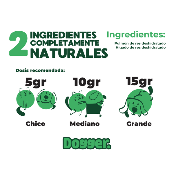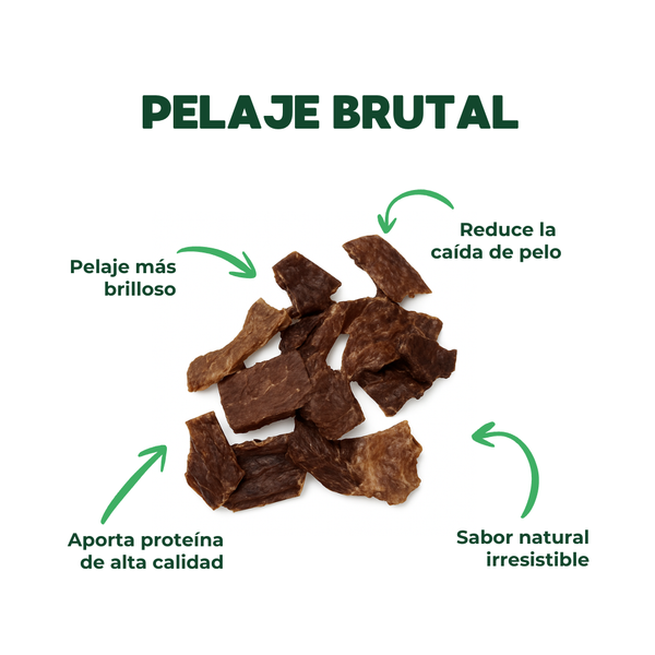 Está hecho con hígado y pulmón de res deshidratados, dos ingredientes 100% naturales, altamente nutritivos y deliciosos, que ayudan a nutrir el pelaje desde adentro, aportando proteína, vitaminas y minerales clave para que el pelo crezca más fuerte, brillante y saludable.